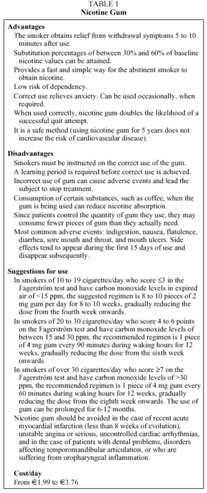 Nicotine gum must be used correctly in order to attain maximum efficacy. Once in the mouth, the piece of gum should be chewed slowly until a strong flavor is noticeable. At this point, the user should stop chewing and park the wad between the cheek and gum until this flavor has disappeared. Uncontrolled chewing of nicotine gum causes the nicotine to be released too fast, in which case it cannot be absorbed through the oropharyngeal mucosa and, rather than producing the desired effect, it is likely to be swallowed and may cause gastric disturbances. Moreover, since it is metabolized in the liver, the ingested nicotine has no therapeutic effect. It is therefore advisable that, before nicotine gum is prescribed, patients should try it out in the presence of the clinician so that they can be instructed on the correct method.31