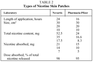2. Nicotine Skin Patch. The patch is impregnated with nicotine, and it releases the substance through the skin to which it is adhered. There are two types of patches: those which release nicotine for 24 hours, for use during the entire day and night; and those which release nicotine for 16 hours, for use during the waking hours. Table 2 shows the different kinds of nicotine patches available on the Spanish market.6,8,9