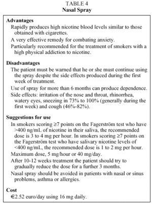 The 2 mg nicotine gum should be used only for smokers with low dependence who smoke their first cigarette more than 30 minutes after waking. The patches have been shown to be less effective in highly dependent smokers than in those with low or moderate dependence.33,34,39 The 4 mg gum is highly recommended for smokers with a moderate to high degree of physical dependence on nicotine, and in these cases it is helpful long the treatment for 3 to 6 months, or even 1 year.33,34,39 Nasal spray is highly indicated for smokers with a high degree of physical dependence on nicotine.