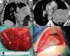(a and b) A chest CT showed a 12cm×16cm mass with compression of mediastinum. (c) Specimen after a left intrapericardial pneumonectomy with an en bloc resection of the 4–7th left ribs and a segment of diaphragm (L – lung, R – ribs, D – diaphram). (d) Closure of the wall defect using a 20cm×15cm composite polyester mesh with collagen film (SYMBOTEX™).