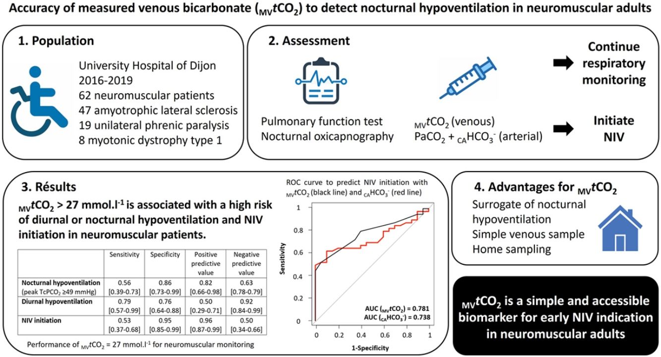 Recent data suggest that a measured venous total CO2 concentration (MVtCO2) >27mmol/L could serve as a surrogate marker of nocturnal hypoventilation in NMD [6]. Since nocturnal hypercapnia may cause residual metabolic alkalosis during the day, elevated MVtCO2 may help detect early ventilatory failure in NMD.