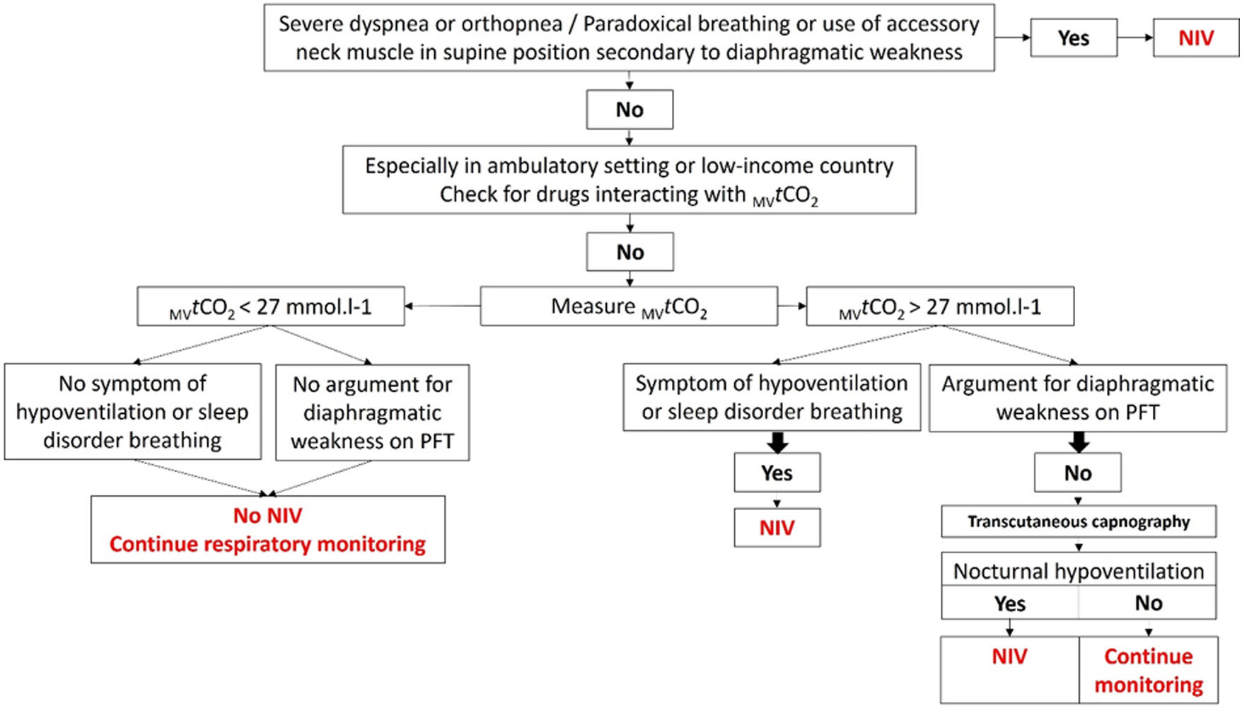 Algorithm including measured venous total carbon dioxide concentration (MVtCO2) to screen respiratory involvement in neuromuscular patients. Abbreviations: MVtCO2: measured venous total carbon dioxide concentration; NIV: non-invasive ventilation; PFT: pulmonary function test. Rythm for respiratory monitoring depends on the aetiology of NMD.