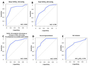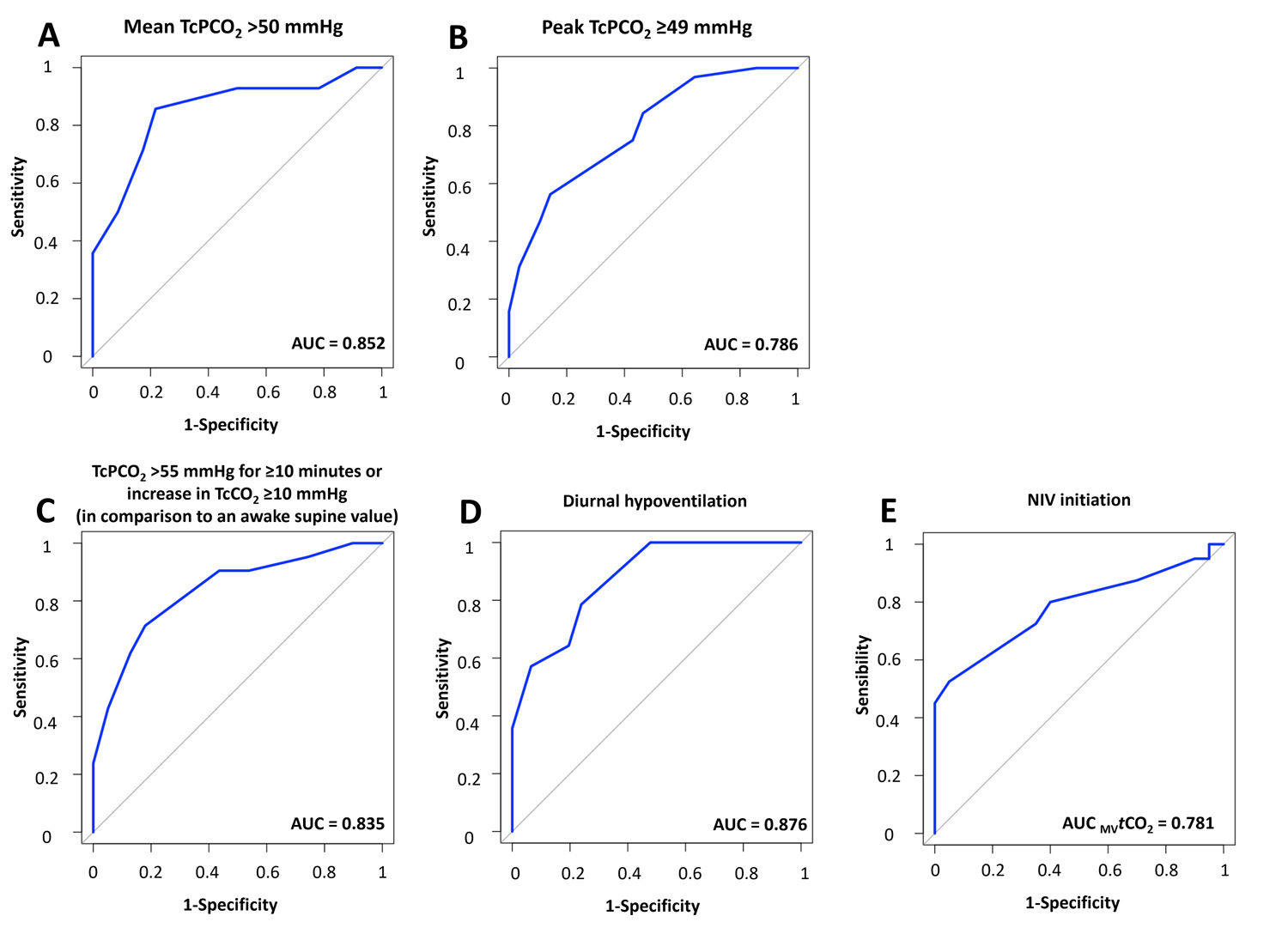 MVtCO2 demonstrated strong predictive performance for diurnal (AUC 0.876 [95% CI: 0.783–0.968]) and nocturnal hypoventilation (definition 1: AUC 0.852 [95% CI: 0.723–0.980]; definition 2: AUC 0.786 [95% CI: 0.675–0.898]; definition 3: AUC 0.835 [95% CI: 0.783–0.968]) and NIV initiation (AUC 0.781 [95% CI: 0.669–0.893]) (see supplemental material for figure).