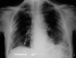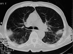 Varón de 74 años, ex fumador de 37 paquetes-año, sin alergias conocidas, diagnosticado de ELA hacía 10 meses y en tratamiento con Rilutek® (riluzol), a dosis de 50 mg/12 h, desde hacía 5 meses, que 45 días antes del ingreso en nuestro centro había iniciado un cuadro clínico consistente en tos no productiva. Inicialmente había recibido tratamiento con amoxicilina-ácido clavulánico a dosis de 875 mg-125 mg/8 h durante 18 días, hasta 5 días antes de su ingreso, con progresivo deterioro clínico consistente en incremento de la tos no productiva, disnea de reposo, astenia, sudación profusa, taquipnea, sin objetivar fiebre durante todo el período de evolución del proceso. En la exploración efectuada en el momento del ingreso hospitalario estaba afebril, con una presión arterial de 110/60 mmHg, frecuencia cardíaca de 94 lat/min y frecuencia respiratoria de 24 respiraciones/min. Se apreció una disminución de la amplitud de los movimientos respiratorios sin otros hallazgos de interés. La gasometría arterial con oxígeno en gafas a 2 l/min mostró los siguientes valores: pH de 7,46, presión arterial de oxígeno de 67 mmHg, presión arterial de anhídrido carbónico de 44 mmHg y HCO3 de 31 mEq/l. En la analítica, el hemograma presentó 6.200 leucocitos (un 68% neutrófilos y un 1% eosinófilos) y una velocidad de sedimentación globular de 74 mm en la primera hora. Existía elevación de las cifras de fibrinógeno (715 mg/dl), inmunoglobulina (Ig) G (1.960 mg/dl; IgG1: 1.310 mg/dl; IgG4: 280 mg/dl), IgA (498 mg/dl), IgE (299 KU/l) y proteína C reactiva (20 mg/l). El resto de las determinaciones analíticas, incluidos los parámetros hematológicos, glucemia, iones, parámetros de función renal, hepáticos, lactatodeshidrogenasa y sus isoenzimas, enzima de conversión de la angiotensina, IgM, anticuerpos antinucleares, anti-ADN, anticuerpos anticitoplasma de neutrófilo y marcadores tumorales séricos, estaban dentro de los valores considerados normales. La prueba de Mantoux, las serologías frente a gérmenes atípicos y virus respiratorios, así como las determinaciones en orina para Legionella pneumophila serotipo 1 y Streptococcus pneumoniae, fueron negativas. A pesar de estar afebril, durante su ingreso se extrajeron hemocultivos, sin que se aislara ningún germen. El paciente no expectoraba, por lo que no se pudieron obtener muestras para procesamiento bacteriológico. El electrocardiograma y un ecocardiograma no objetivaron anomalías. Las pruebas cutáneas a una batería de neumoalergenos habituales, entre ellos ácaros, pólenes de malezas, árboles, gramíneas, hongos y epitelios, fueran negativos. La radiografía y la tomografía computarizada de tórax mostraron infiltrados alveolointersticiales bilaterales (figs. 1 y 2).