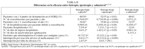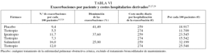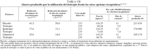 En la tabla VI25,27,29 se muestran los resultados del análisis farmacoeconómico realizado a partir del número de exacerbaciones de los pacientes incluidos en los ensayos clínicos analizados. El número de exacerbaciones por cada 100 pacientes con EPOC en el grupo de tiotropio fue un 41% menor que en el grupo placebo (cualquier medicación a excepción de broncodilatadores de larga duración), lo que supone un ahorro por cada 100 pacientes en tratamiento con tiotropio frente a placebo de más de 7.200 €. Cuando se compara el tiotropio con el ipratropio, el número de exacerbaciones se reduce en más del 37% con el primero, lo que supone un ahorro por cada 100 pacientes superior a 8.000 €. Este ahorro fue superior a 6.600 € al comparar el tiotropio con el salmeterol, debido a una disminución del 25% en el número de exacerbaciones.