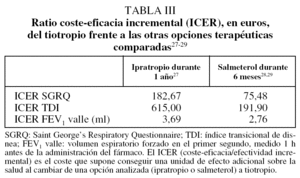 En la tabla III27-29 se muestran los resultados de coste-eficacia incremental del tiotropio frente a las otras opciones estudiadas. Es decir, el coste que supone conseguir una unidad de efecto adicional sobre la salud al cambiar de una de las alternativas evaluadas (ipratropio o salmeterol) al tiotropio.