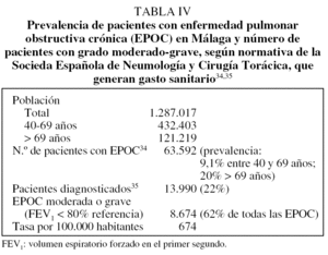 Un análisis que nos aproxima más si cabe a la realidad hospitalaria es aquel que tiene en cuenta la reducción del número de ingresos hospitalarios de estos pacientes a causa de las exacerbaciones, además de la reducción del número de días de estancia hospitalaria, algo que es más importante dentro del hospital una vez que se ha producido el episodio. Para ello, partiremos de los datos de prevalencia de la enfermedad del estudio IBERPOC34, según el cual por cada 100.000 habitantes habrá 9.100 pacientes con EPOC, de los que sólo el 22% estará diagnosticado y generará gasto sanitario (2.002 pacientes)35; de ellos, en el 62% la enfermedad será moderada o grave, según criterios de la European Respiratory Society, lo que nos ofrece un total de 1.241 pacientes (tabla IV). Los datos referentes a la población se han obtenido del Instituto Nacional de Estadística en su revisión del censo del 200136.
