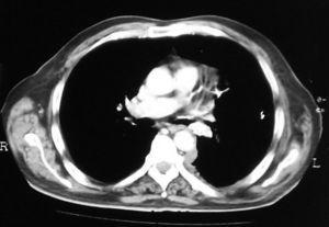 Fig. 2. Tomografía computarizada de tórax que objetiva una estenosis por tumoración en el segmento VI del bronquio.