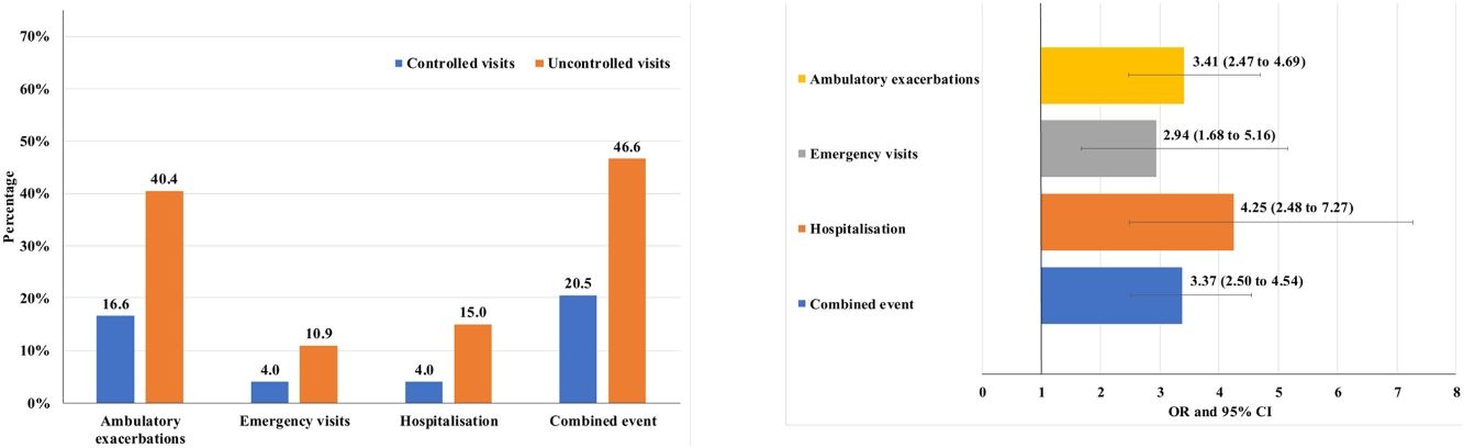 Odd ratios with 95% confidence intervals (CI) were used to assess the risk of an outcome in the 6 months after an uncontrolled visit compared to a controlled visit. For all the tests p-values<0.05 were considered statistically significant. The statistical package R Studio (V2.5.1) was used for the statistical analyses.
