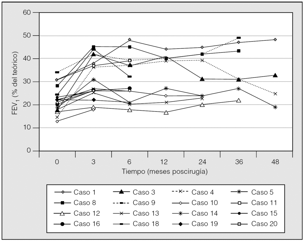 Al igual que estos autores, hemos observado en nuestra serie un amplio rango de mejoría en el volumen espiratorio forzado en el primer segundo (FEV1) tras la intervención quirúrgica (entre 86 y 871 ml) que alcanzaron en la mayoría de los casos entre los 3 y 6 meses, sin que ningún dato prequirúrgico nos permita predecir esta respuesta. Sin embargo, mientras que en el grupo de Juan et al1 sólo un paciente mantenía la mejoría a los 2 años, en nuestra serie (fig. 1) 9 pacientes mantenían a los 2 años mejor función que antes de la cirugía y en 3 casos la mejoría del FEV1 fue superior a 200 ml. A los 4 años de la intervención, 3 pacientes tenían mejor función pulmonar que antes de la cirugía.
