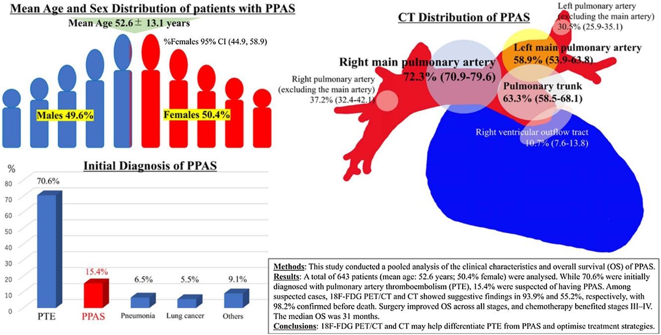 ResultsOverall, 643 patients were included (mean age: 52.6±13.1 years; 50.4% were female). Initially, 70.6% were diagnosed with pulmonary thromboembolism (PTE), and 15.4% were suspected of having PPAS. Among these, 93.9% and 55.2% showed suggestive findings on computed tomography (CT)-integrated positron emission tomography with 2-deoxy-2-18F-fluoro-d-glucose (18F-FDG PET/CT) and CT, respectively, with 98.2% confirmed before death. The right main pulmonary artery was the most affected site on CT (72.3%). Surgery and chemotherapy were performed in 81.4% and 66.4% of patients, respectively. The median OS was 31 months, with surgery extending OS across all stages and chemotherapy benefiting stages III–IV. Longer OS was achieved in patients who underwent complete surgical resection.