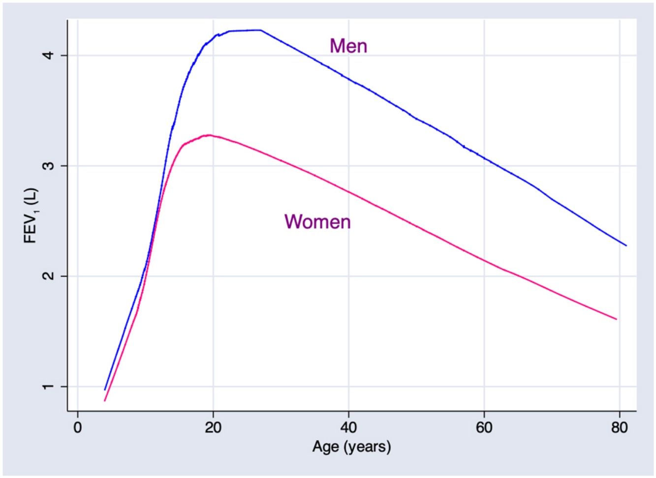 This study is based on a compilation of tests performed at different times and using 3 distinct types of spirometers, though all devices were high-quality instruments that satisfy international standards and calibration was verified daily. Also, participants were obtained through different approaches, including population-based sources (the PLATINO study), a random sample of schools (the EMPECE study), and convenience samples in the remaining. On the other hand, the criteria applied to determine that participants were healthy were similar in all studies: non-obese never-smokers who were free of respiratory symptoms and had no previous diagnoses of respiratory diseases. In addition, spirometry tests were performed by expert technicians following international quality standards. All age groups had a considerable number of participants, but decreased above 60 years of age, reducing the precision of estimates for older individuals.