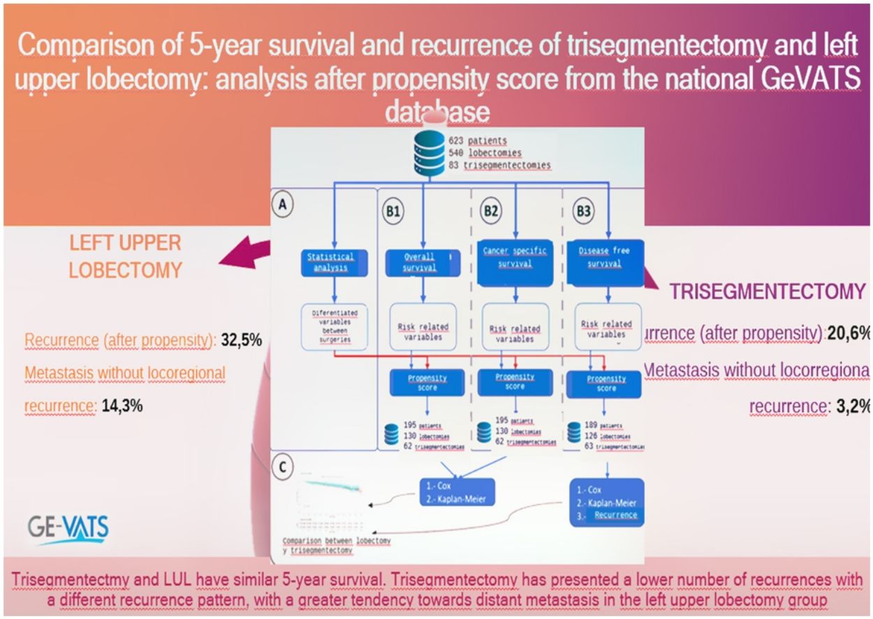Our objective was to compare survival and recurrence after trisegmentectomy versus left upper lobectomy procedures registered in the Spanish Video-Assisted Thoracic Surgery group (GEVATS) database.