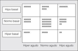 Fig. 1. Representación gráfica de los asmáticos (caso a caso) en función de su percepción de disnea en situación estable (basal) y tras una broncoconstricción aguda. X: número de casos; hipo: hipoperceptor de disnea; normo: normoperceptor de disnea; hiper: hiperperceptor de disnea.