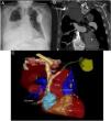 A) Arriba a la izquierda, radiografía de tórax en la que se observa el electrodo de la aurícula derecha con su extremo distal más lateralizado de lo que debería, con derrame pleural ipsilateral asociado. B) Arriba a la derecha, corte coronal donde se observa el electrodo enclavado en el parénquima pulmonar y derrame pleural derecho. C) Abajo, reconstrucción en 3D de la tomografía computarizada en la que puede observarse el electrodo del DAI en el momento de la perforación de la aurícula derecha. A la derecha, A. Pulmonar: arteria pulmonar.