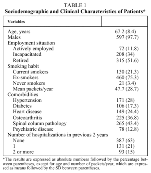 Patients were consecutively enrolled in the study, had been diagnosed with COPD at least 6 months before, and had been followed at our clinics for at least 6 months prior to enrollment in the study. The clinical situation of the patients had to have been stable (no increase in respiratory symptoms or modifications in treatment) over the 6 weeks prior to enrollment.
