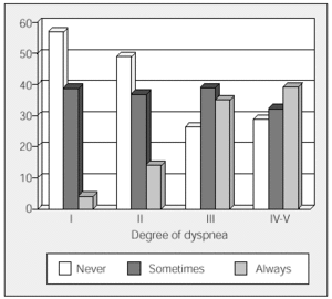 Figure 1. Relation between degree of dyspnea, measured according to the scale of Fletcher et al,5 and limitation in activities of daily living. The histogram includes the percentages of patients who presented the various degrees of limitation to activities of daily living within each degree of dyspnea.