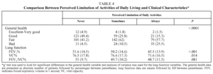These same authors used the Saint George's Respiratory Questionnaire to measure the relationship between limitation of activities of daily living and quality of life, and found good correlations for the domains "impact," "activity," and the total score but not with "symptoms," as aspects such as cough and expectoration are included but not dyspnea.