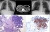 Pathology report results were negative for neoplastic cells, so a bronchoscopy was scheduled. In the chest X-ray conducted before this examination, the pulmonary nodules were seen to have grown significantly (Fig. 1). Bronchoscopy revealed a mass with a necrotized surface and soft consistency in the wall of the posterior segment of the left lower lobe (B10), with partial stenosis of the bronchus. Brushing was performed and a biopsy was obtained, and selected bronchial material was aspirated. The endoscopic judgment was direct signs of neoplasia in the left B10, and the pathology results from the endobronchial biopsy gave a diagnosis of primary carcinoma in the adrenal cortex, with the following immunohistochemical features: inhibin positive, and CK7, TTF-1 and napsin negative (Fig. 1).