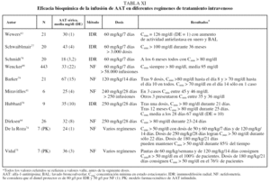 El tratamiento médico de los pacientes con enfisema por DAAT debe comprender las medidas farmacológicas y no farmacológicas comunes a los pacientes con EPOC sin DAAT61,62. Desde 1987 se dispone de AAT purificada procedente de plasma de donantes para administración intravenosa. La sustancia infundida se ha demostrado que mantiene su actividad enzimática en plasma y en lavado broncoalveolar; además su actividad pulmonar se correlaciona de forma directa con su concentración plasmática, lo que permite monitorizar el tratamiento a través de la determinación de las concentraciones plasmáticas mínimas en estado estacionario (Cmin), también llamadas concentraciones valle, que se corresponden con las concentraciones obtenidas antes de la siguiente dosis tras las necesarias para alcanzar el estado estacionario63. A partir de estudios epidemiológicos, se ha considerado que la Cmin de 0,8 g/l determinados por inmunodifusión radial o 0,5 g/l por nefelometría son capaces de proporcionar una protección adecuada al pulmón comparado con individuos normales no fumadores1. Como la vida media de la AAT infundida es de 4-5 días, las primeras pautas de administración ensayadas tuvieron una periodicidad semanal63. Aun en la actualidad, la pauta recomendada en ficha técnica es de 60 mg/kg/semana. No obstante, debido al evidente inconveniente de la administración semanal del tratamiento de por vida, se han ensayado otras pautas cada 14, 21 y 28 días. Los resultados de estas distintas pautas de administración desde el punto de vista bioquímico se recogen en la tabla XI.