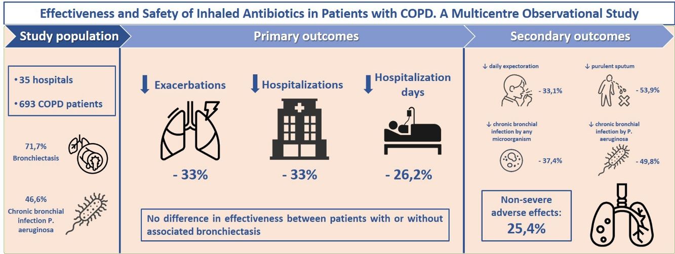 ResultsOf 693 COPD patients analyzed (aged 74.1; 86.3% men; mean FEV1=43.7%), 71.7% had bronchiectasis and 46.6% presented chronic bronchial infection (CBI) by Pseudomonas aeruginosa (PA). After 1 year of treatment with inhaled antibiotics, there was a significant decrease in the number of exacerbations (−33.3%; P<.001), hospital admissions (−33.3%; P<.001) and hospitalization days (−26.2%; P=.003). We found no difference in effectiveness between patients with or without associated bronchiectasis. Positive patient outcomes were more pronounced in PA-eradicated patients. We found a significant reduction in daily expectoration (−33.1%; P=.024), mucopurulent/purulent sputum (−53.9%; P<.001), isolation of any potentially pathogenic microorganisms (PPM) (−16.7%; P<.001), CBI by any PPM (−37.4%; P<.001) and CBI by PA (−49.8%; P<.001). CBI by any PPM and ≥three previous exacerbations were associated with a better treatment response. 25.4% of patients presented non-severe side-effects, the most frequent of these being bronchospasm (10.5%), dyspnoea (8.8%) and cough (1.7%).