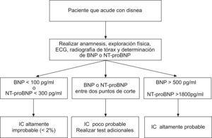 Figura 1. Aproximación al diagnóstico de insuficiencia cardíaca basada en los valores de BNP y NT-proBNP. BNP: péptido natriurético tipo-B; ECG: electrocadiograma; IC: insuficiencia cardíaca; NT-proBNP: fragmento N-terminal del propéptido natriurético tipo B.
