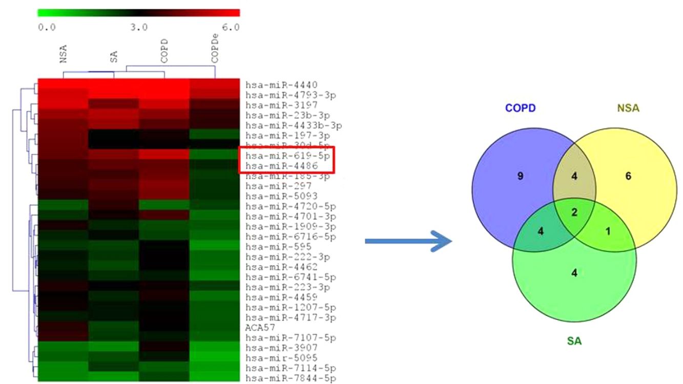 ResultsThirty differentially expressed miRNAs (eBAYES p<0.05, fold change ≥2) were found among the different groups of patients regarding COPDe: 19 COPD-vs-COPDe, 13 NSA-vs-COPDe, 11 SA-vs-COPDe. A characteristic down-regulated miRNA expression pattern was identified in COPDe patients. Differential expression of miR-619-5p and miR-4486 in COPDe patients were validated in the complete cohort (n=274).