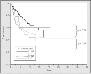 La supervivencia estimada mediante el análisis univariante con respecto a la variable transfusión/no transfusión de hemoderivados fue del 78, el 63 y el 54% a los 2, 5 y 10 años, respectivamente, para el grupo de pacientes no transfundidos, y del 73, el 59 y el 46% para el grupo de transfundidos. La comparación de ambas curvas de supervivencia no mostró diferencias significativas (p = 0,23) (fig. 2). Igualmente el estudio de la variable transfusión, con la separación de las poblaciones clasificadas como T1 o T2, no mostró influencia sobre su pronóstico (fig. 3). Tampoco esta variable mostró una influencia negativa en la supervivencia a la hora de valorar el grupo de pacientes cuya causa de muerte fue atribuible directamente al cáncer (fig. 4). El resto de resultados de las variables analizadas se muestran en la tabla II.
