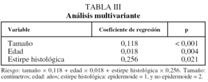 En el análisis multivariante entraron en regresión las variables tamaño tumoral, edad y variedad histológica epidermoide/no epidermoide. En este análisis no se demostró ninguna relación de la transfusión con la supervivencia (tabla III).