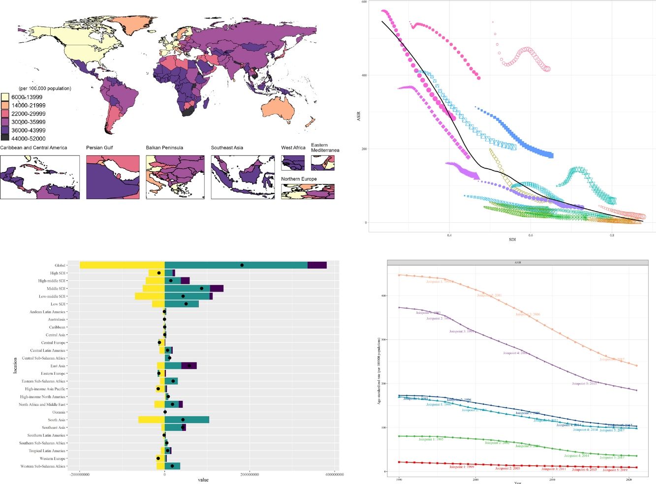 ResultsAt the global level, in the first phase Directly-Observed Treatment Strategy (DOTS), the annual reduction in incidence was 1.18%, and prevalence was 0.71%. In the second phase Stop TB, the cumulative mortality decrease was 56.44% which met the desired goal. However, the cumulative decrease of prevalence was only 20.45%. In the third phase End TB, annual rate of reduction in mortality was 3.33%, while the annual rate of reduction in incidence was 1.14%. ASPR showed a large decrease in both low socio-demographic index (SDI) and high SDI regions, the decrease in medium SDI region was small, which might be dominated by demographic factors at the DOTS stage, changed to epidemiologic in the Stop TB stage and to aging factors in the End TB stage.