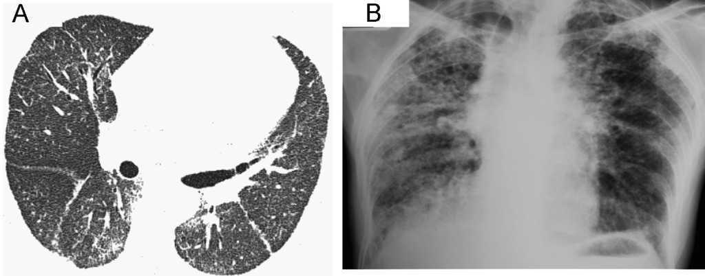 Figura 1. La tomografía computarizada de alta resolución (A) muestra una imagen discreta y difusa de vidrio deslustrado, así como opacidades reticulares periféricas y en parche. No se aprecia panal de abeja. La radiografía de tórax (B) demostró disminución de los volúmenes pulmonares e infiltrados reticulonodulares de predominio apical, así como panal de abeja periférico y bibasal con ensanchamiento de la arteria pulmonar.