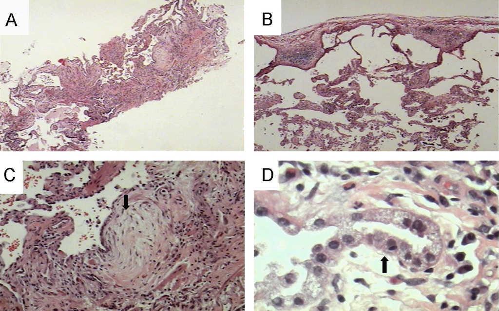 Figura 2. A y B: vistas panorámicas donde se aprecia la afección predominantemente periférica. (Hematoxilina-eosina, aumento original ×1 y ×10.) C: se aprecia un foco de miofibroblastos, indicado por la flecha. (Hematoxilina-eosina, aumento original ×10.) D: gran hipertrofia y vacuolización de neumocitos tipo 2 (flecha). (Hematoxilina-eosina, aumento original ×40.)