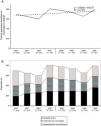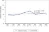 Representación de la evolución en las altas de hospitalización (línea gruesa) y su complejidad (línea fina) en el período estudiado. Las tendencias aparecen como líneas discontinuas. Fuente: Cots et al.9.