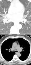 Visible mediastinal and peribronchial lymph nodes were detected in 56 (96.5%) and 46 (79.3%) patients, respectively; 47 and 39 of whom showed calcified lymph nodes, respectively. Six (10.3%) and 13 (22.4%) patients had mediastinal and peribronchial lymphadenopathies, respectively, with a short axis diameter of more than 10mm. Pressure effect on adjacent bronchi by the calcified lymph nodes was detected in 21 (36.2%) cases (Fig. 3b).