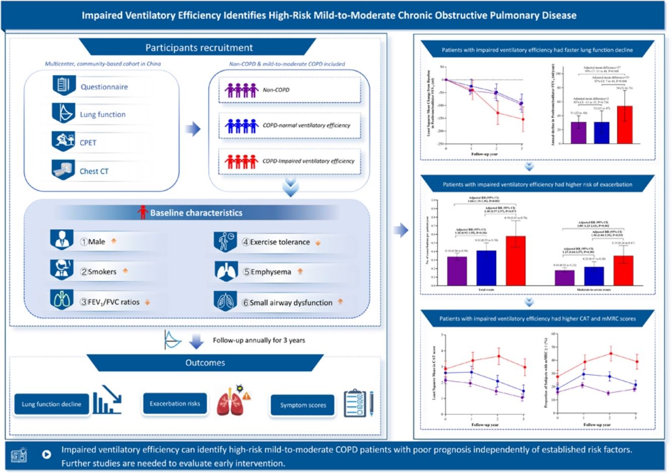 MethodsThis was a prospective cohort study conducted from July 2019 to September 2024 (encompassing the COVID-19 pandemic period) in China. Non-COPD subjects and mild-to-moderate COPD patients who completed questionnaires, lung function tests and cardiopulmonary exercise tests at baseline were annually followed up over 3 years. Subjects with predefined high-risk criteria, including CAT score≥10, mMRC score≥2, postbronchodilator FEV1<60% predicted, and frequent exacerbations, were further excluded. Impaired ventilatory efficiency was defined as a nadir minute ventilation/CO2 output≥the upper limit of normal. Outcomes included annual lung function decline, exacerbation risks, and symptom scores.