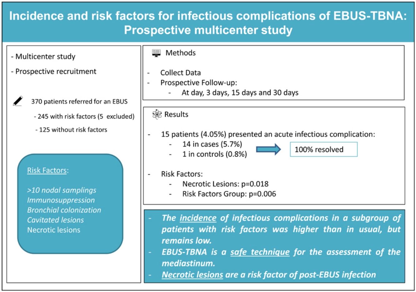 MethodsWe conducted a prospective multicenter study, with all consecutive patients referred for an EBUS-TBNA with patients at risk of developing an infectious complication (considering>10 nodal samplings, known immunosuppression, bronchial colonization and cavitated or necrotic lesions) and a second group without any risk factor.