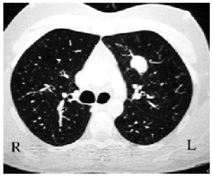 Figure 1. Chest CT scan showing a well-defined in traparenchymal pulmonary lesion. The postoperative diagnosis was inflammatory pseudotumor.