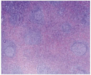 Figure 2. Microscopic view of an inflammatory pseudotumor. The pulmonary parenchyma is occupied by a fibrous area containing lymphoid follicles.