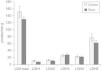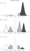 El valor de la LDH total (130±30 frente a 152±50μmol/min/g de tejido húmedo) y las concentraciones de las distintas isoenzimas (fig. 1), así como su distribución porcentual, fueron similares en pacientes y controles. Los pacientes no presentaron diferencias en la proporción de los tipos de fibra comparados con el grupo control (tipo I: un 44±2 frente a un 48±2%; tipo IIA: un 37±2 frente a un 32±4%; tipo IIX: un 19±3 frente a un 20±4%). Al observar las curvas de proporción de las isoenzimas, 5 pacientes tenían una distribución diferente, mientras que 13 presentaban curvas similares a las de los controles. En la figura 2 se muestran los resultados de la lectura densitométrica de la electroforesis en gel de agarosa del extracto muscular de un sujeto control (fig. 2A), y las correspondientes a 2 pacientes que mostraron curvas distintas de las de los controles (fig. 2B y C). Al tratar de caracterizar a los 5 pacientes con patrón de curva desviado, se encontró que, si bien el total de la enzima LDH fue similar al resto de los pacientes, el valor de las isoenzimas era diferente, con disminución de la LDH5 y aumento de las LDH3, LDH2 y LDH1 (fig. 3).