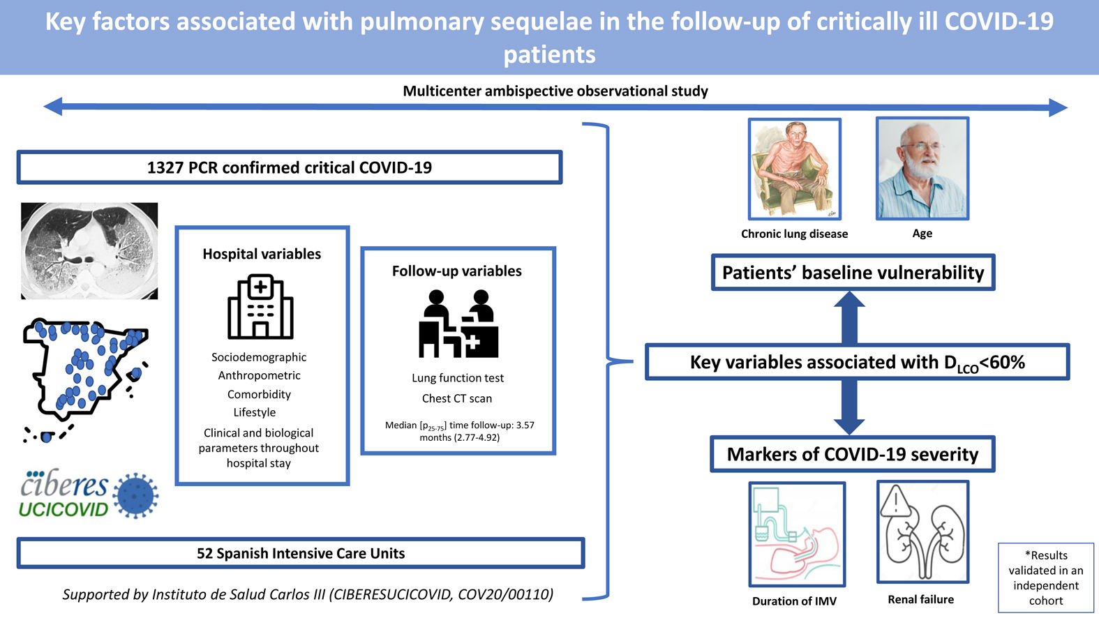 Some predictors of pulmonary involvement after COVID-19 have been described in the literature, the most important being the severity of the disease in the acute phase7,9 and its respiratory management,10 sex,7,11,12 age,12 and previous comorbidities.11,12 These studies are descriptive cohorts of patients in which the primary objective was to assess pulmonary sequelae during the follow-up. In addition, only one of these studies10 focused on critically ill survivors. In this regard, there is a lack of studies aiming to determine the key factors associated with respiratory sequelae after hospital discharge that have a representative sample of critically ill COVID-19 patients with the required characterization and follow-up.