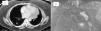 A) TAC torácica que muestra un corte transversal de la masa paramediastínica izquierda y un nódulo en el segmento 6 derecho que se biopsió. B) Resonancia magnética torácica que muestra masa paramediastínica izquierda de 11cm heterogénea, con componente sólido y quístico, lobulada y de contornos bien definidos.