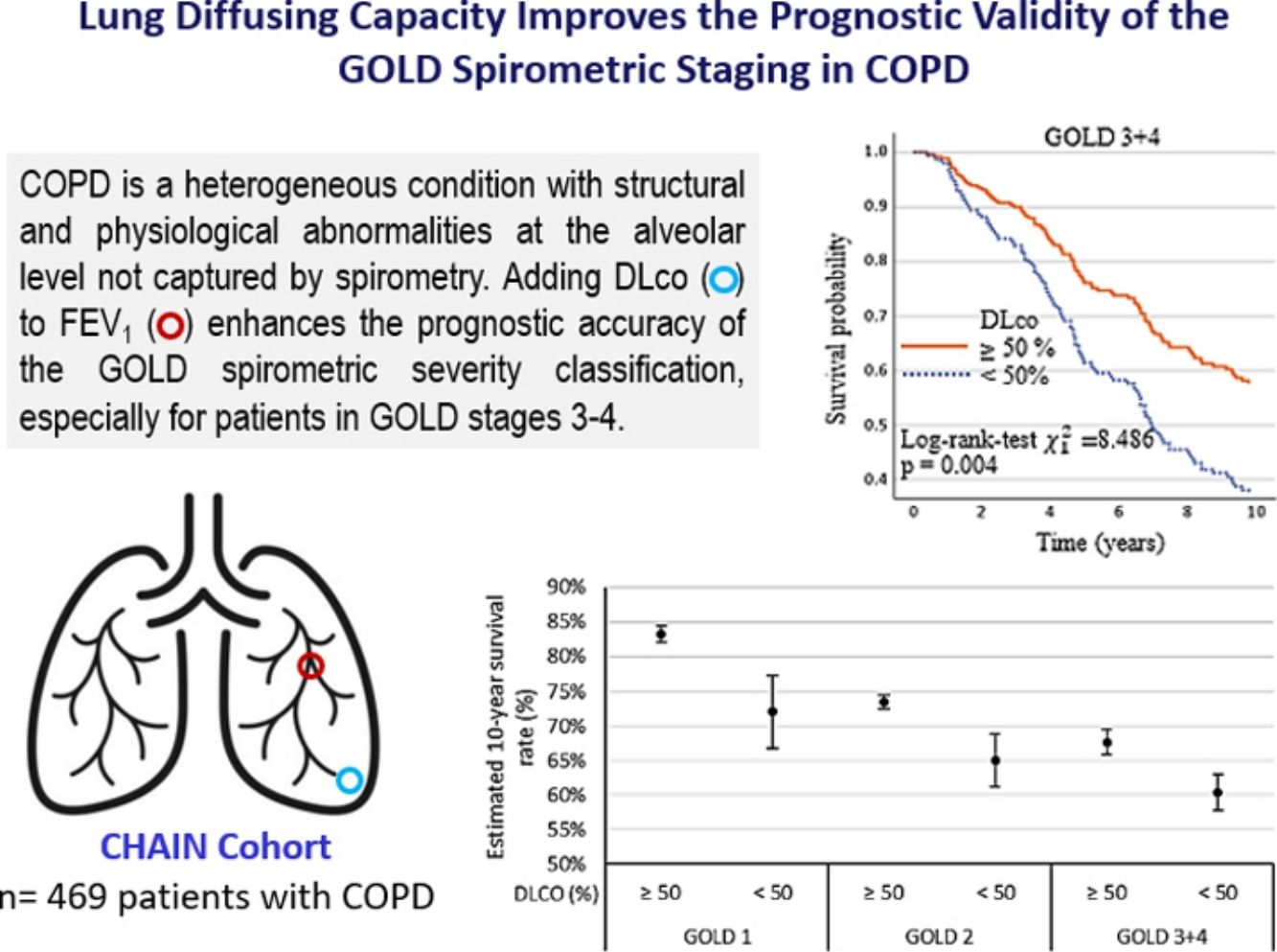 MethodsWe followed 469 patients (mean age 64 years, 58% FEV1) with complete lung function tests in the Spanish multicenter CHAIN study for up to 10 years, with mortality as the main outcome. Patients were dichotomized based on DLco impairment (<50% cutoff). A Cox proportional hazard model evaluated the added value of DLco to GOLD FEV1 spirometric staging for all-cause and respiratory mortality. Validation of the results was conducted in the Kingston COPD Canadian cohort (N=300 patients).