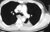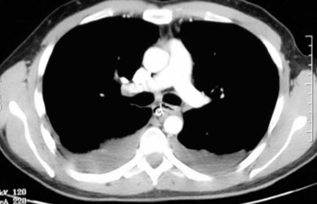 Fig. 1. Tomografía computarizada de tórax postoperatoria donde se visualiza el tubo de drenaje torácico colocado en el mediastino posterior vía transcervical.
