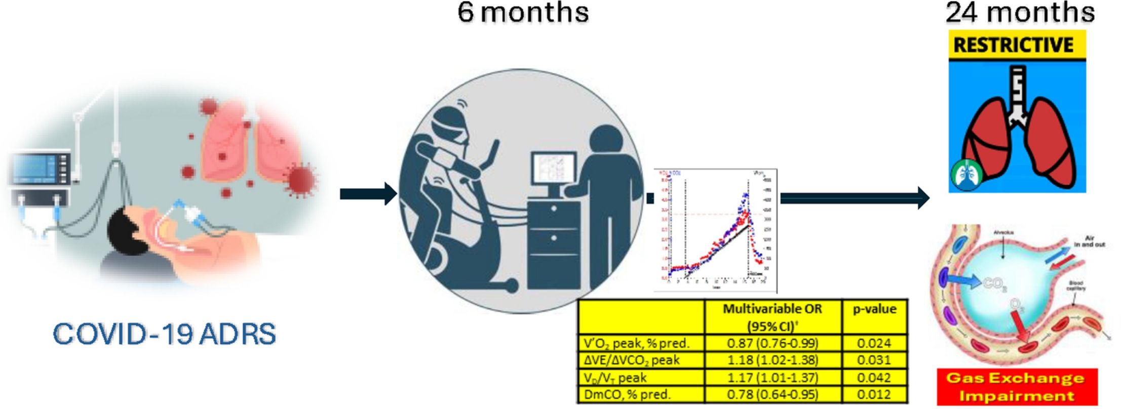 The main finding of our study is the demonstration that nearly half of the survivors of severe ARDS secondary to COVID-19 exhibit moderate to severe functional disability in the medium term. This impairment is more common in women, individuals with a history of hypothyroidism, and in the presence of concurrent reductions in residual functional capacity, increased lung parenchyma attenuation, and decreased diffusion membrane component. Additionally, both progressive cardiorespiratory exercise testing and analysis of the diffusion membrane component provide additional value in predicting long-term functional deterioration among those survivors who, at six months post-ICU discharge, exhibit reduced TLC or DLCO values. Thus, both the diffusion membrane component and exercise tolerance, along with parameters related to dead space and gas exchange at peak exercise, are independently associated with the persistence of a restrictive disorder associated with gas exchange impairment at 24 months post-discharge, suggestive of lung fibrosis development.