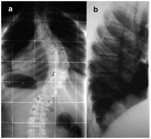 Figure. 1. Thoracoabdominal x-ray showing posteroanterior (a) and lateral (b) views of a spine with scoliosis.