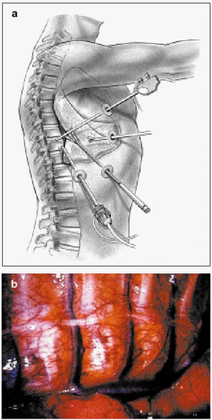 Figure 5. An artist's depiction (a) and a surgical image (b) of thoracoscopy.