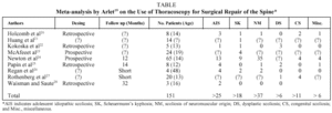 Arlet19 published a meta-analysis of 151 studies that attempted to answer prevailing questions about the indications for thoracoscopy in spinal deformities. Only 57 of the articles found, however, were relatively acceptable. Twenty-one were about spinal fusion, 11 on spinal release, and the rest on complications of thoracoscopy. Of the 57, only 9 were considered optimal sources of evidence (Table).20-28 Most cases involved children, in whom the spine is much more flexible than it is in the adult. It is interesting to note, moreover, that the mean angle of curvature was 65º for the cases published, although the anterior approach is widely held to be indicated only for patients with curvatures greater than 75º and with radiologically evident lateral bending of less than 50º. However, thoracoscopy might be justified for preventing the development of the flat-back syndrome, performing epiphysiodesis with the aim of eliminating growth and/or performing disk removal to afford flexibility to the spine. From a technical standpoint, all the reports reviewed approached the spine from the convex side of the curvature, with the patient in lateral decubitus position, with selective collapse of the ipsilateral lung (as is the case in open thoracotomy). The learning curve rose very gradually for this technique, given that training is needed for the approach phase and for the performance of disk removal itself. An additional problem is the difficulty of evaluating the amount of intervertebral disk removed. The duration of interventions (mean 2.5 hours) was unrelated to type of deformity. When an operation included a period in which a posterior approach was taken, the duration of surgery was much longer (10 hours). Successful repair of the deformity was achieved in 56% to 63% of cases. The cost of thoracoscopy was 30% higher than that of open thoracotomy,14 when the learning curve, material, equipment depreciation, hours in the operating room, and the need for immediate availability for conversion to open thoracotomy were all taken into account. The mean duration of hospitalization was 9 days. Complications developed in 20% of the patients (6% being serious), although they did not affect the final outcomes. The duration of assisted ventilation was seen to be high, more so in patients with neuromuscular problems.
