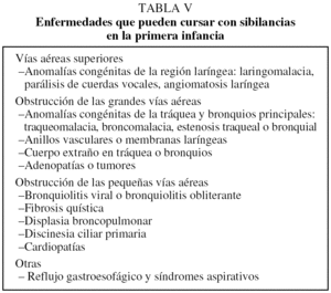 En primer lugar, existen enfermedades muy diversas que se manifiestan con sibilancias durante los primeros años de la vida y cuya presentación clínica puede ser muy similar en unas y en otras, y es un gran reto distinguirlas (tabla V). Cuanto menor es el niño con problemas respiratorios, mayor es la probabilidad de que tenga otras patologías que simulen el asma71. En segundo lugar, la definición de la ACD incluye la falta de respuesta a un tratamiento adecuado. No es raro encontrar niños con episodios de broncospasmo, incluso graves, exclusivamente durante las infecciones respiratorias, y que tienen una mala respuesta a un tratamiento antiasmático adecuado; en muchos de estos pacientes no se produce mejoría a pesar de que se aumente el tratamiento, aunque afortunadamente suelen mejorar con el tiempo72,73. En tercer lugar, no es fácil valorar la falta de control a estas edades, pues muchas veces los síntomas persistentes (tos, sibilancias...) no son específicos de asma, y es difícil objetivar la existencia de obstrucción bronquial mediante pruebas de función pulmonar en los niños más pequeños74,75.