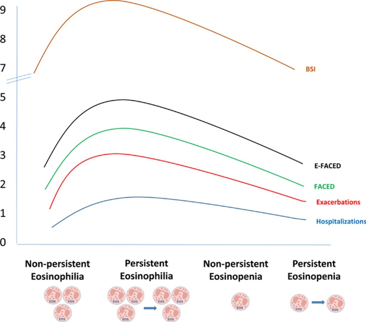 ResultsFive hundred two patients with at least three BEC measures were included; 24.5% and 16.6% presented baseline eosinophilia or eosinopenia, respectively. Of these, 57.7% and 56.6% presented persistent eosinophilia and eosinopenia, respectively. Patients with persistent eosinophilia presented greater severity and a higher number/greater severity of exacerbations than those with non-persistent eosinophilia and those with persistent or non-persistent eosinopenia. Finally, patients with non-persistent eosinopenia presented more severity and a higher number/greater severity of exacerbations than those with non-persistent eosinophilia.