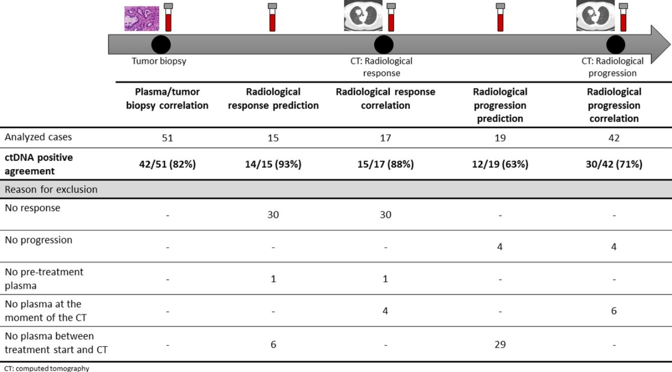In seven cases within this cohort, no plasma sample was available at the time of tumor biopsy and were thus not evaluable for the ctDNA- and tumor-based correlation study, and only second or subsequent treatment lines could be evaluated. When these 7 cases were excluded from the analysis, the rate of concordance between the dynamics of plasma and radiological response and progression were 93.3% and 68.6% respectively.